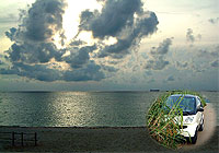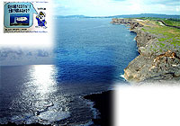 ホテルへ帰る途中、沖縄海岸国定公園にある残波岬に寄り道。 灯台があったので登ってみます。 階段の途中で「うみまる君」からこの灯台が31mある事を教わります。 展望台からの眺めは最高! 荒波が容赦なく崖に打ち寄せます。 まさに「ザンパーン!」 地球が丸い事がはっきりとわかります。 5時というのにまだ陽が高く夕日は諦めました。 Photo:残波岬