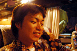 | 新宿でボクの隣に座ることになった、ミュージシャンの駿河央さん(25歳)。 大阪は難波から、ポーランド人の女性二人に東京見物させての帰りとのこと。 写真を見るのが好きだということで、23時45分の消灯時間ギリギリまでボクと二人で話し込む。 |