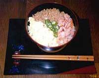 - どんぶりにごはんをいれて、1.2.3.をきれいにもりつけ青味をのせてできあがり。