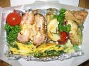 チキンナゲット(*)、プチトマト、いんげんのベーコン巻き、山芋とベーコンのソテー、じゃことほうれん草の卵とじ、らっきょう、お好み焼き(海老・あさり・えび) 今はいい天気ですが、午後また雨が降るそうです。